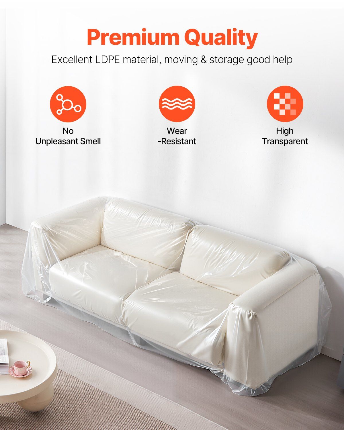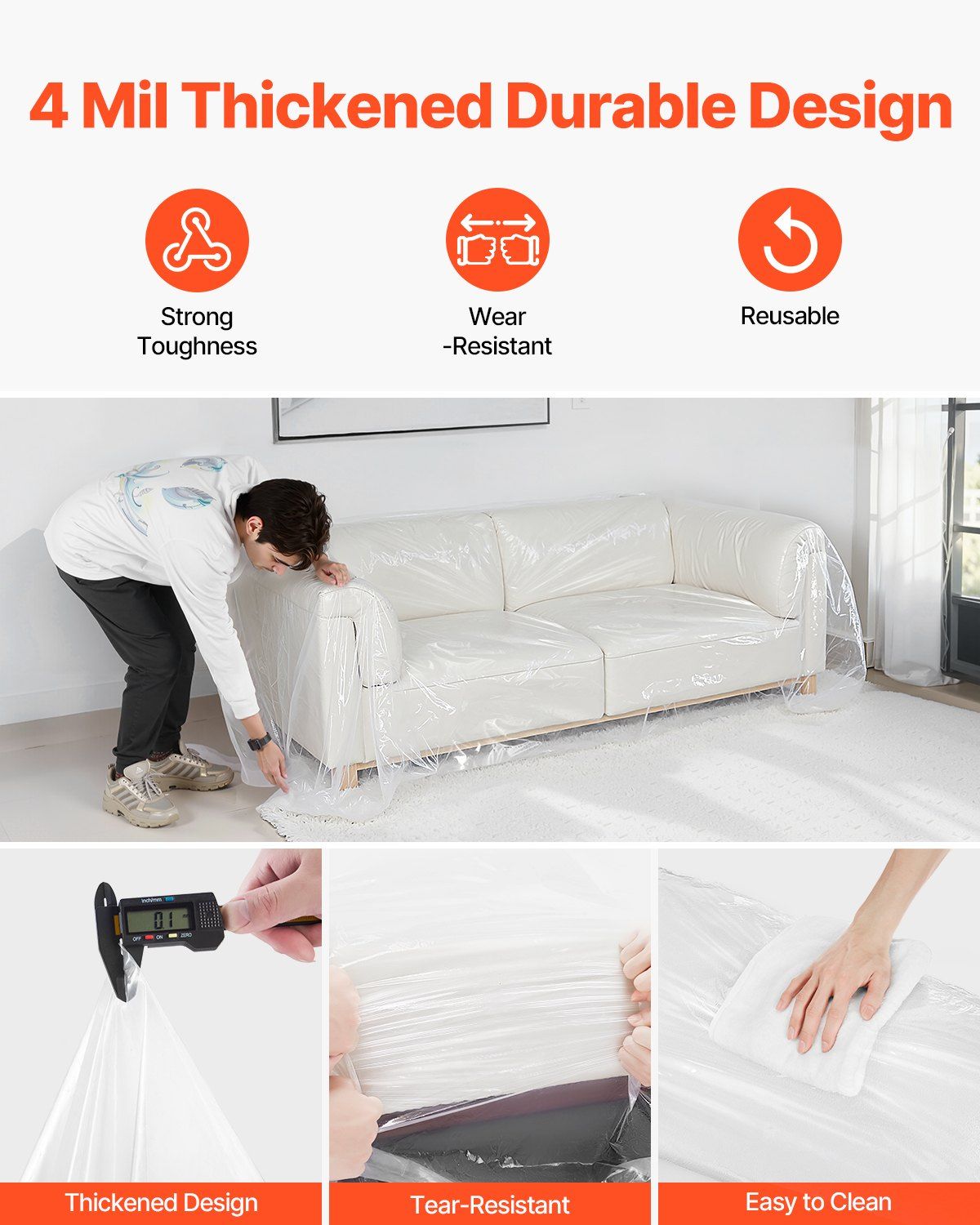 Our plastic couch cover is made of high-quality 4-mil thick LDPE material, providing strong load-bearing capacity, durability against wear and tearing. It effectively protect your sofa from scratches, wear, and dirt, keeping it clean and intact, while extending its lifespan.