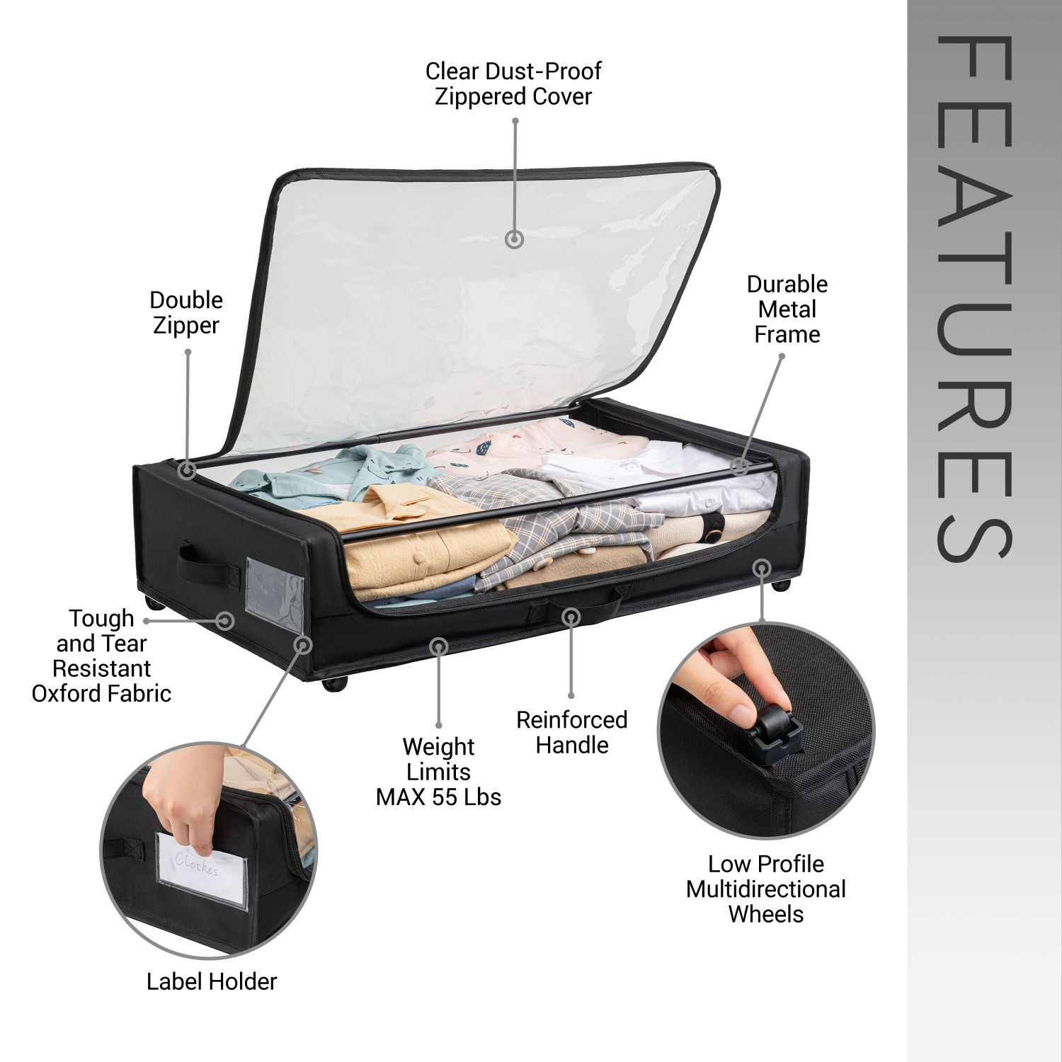 Set of 2 Under-Bed Rolling Storage Container with Transparent Cover, Versatile Space-Saving Design,Declutter your space with this under-bed rolling storage container, designed to maximize storage while maintaining easy accessibility. Assembles in seconds and fits seamlessly under most beds, making it ideal for storing shoes, clothing, bedding, and seasonal items. Equipped with smooth-glide multi-directional wheels for effortless movement, this storage solution ensures hassle-free access to your belongings. A transparent zippered cover offers visibility while protecting items from dust and moisture. Perfect for organizing and optimizing unused space in your home.
